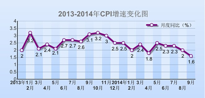 2014年9月份,全国居民消费价格总水平同比上涨1.6%。其中,城市上涨1.7%,农村上涨1.4%;食品价格上涨2.3%,非食品价格上涨1.3%;消费品价格上涨1.4%,服务价格上涨2.3%。1-9月平均,全国居民消费价格总水平比去年同期上涨2.1%。