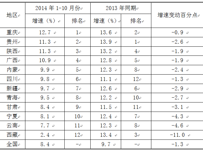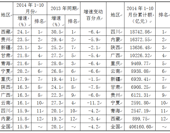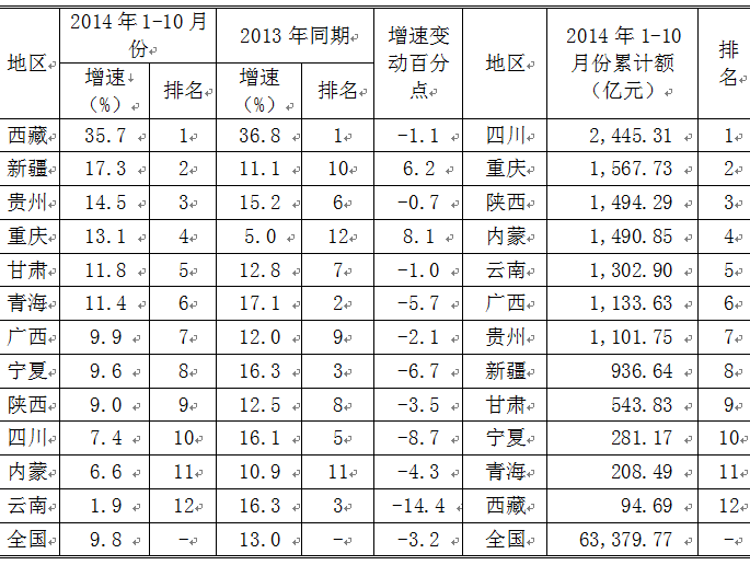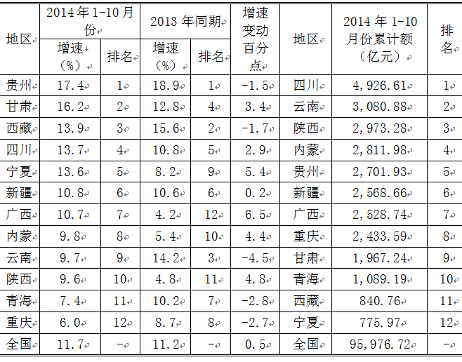 从同比增速来看,2014年1-10月份,西部地区有6个省区保持了两位数增长,有7个省增速高于全国平均水平9.8%,宁夏、陕西、四川、内蒙和云南的增速低于全国平均增速。